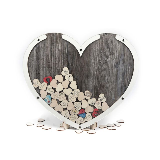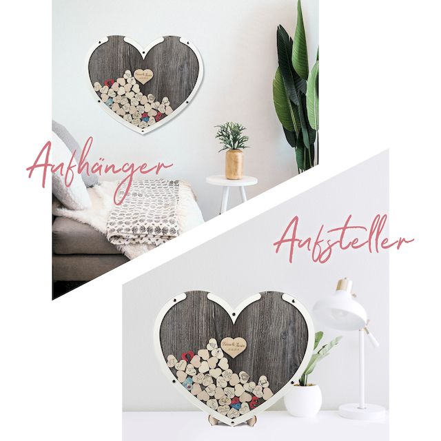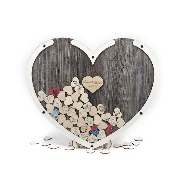 Einfach den Rahmen aufstellen und eure Gäste können sich je nach Größe auf den 100 oder 140 Herzchen verewigen und diese durch den Schlitz oben im Rahmen fallen lassen.