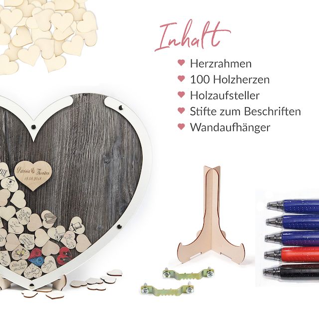 Standfuß, Anweisungskarte, Wandaufhänger, fünf spezielle Stifte und 140 Holz-Herzen zum Beschriften. - MADE IN GERMANY