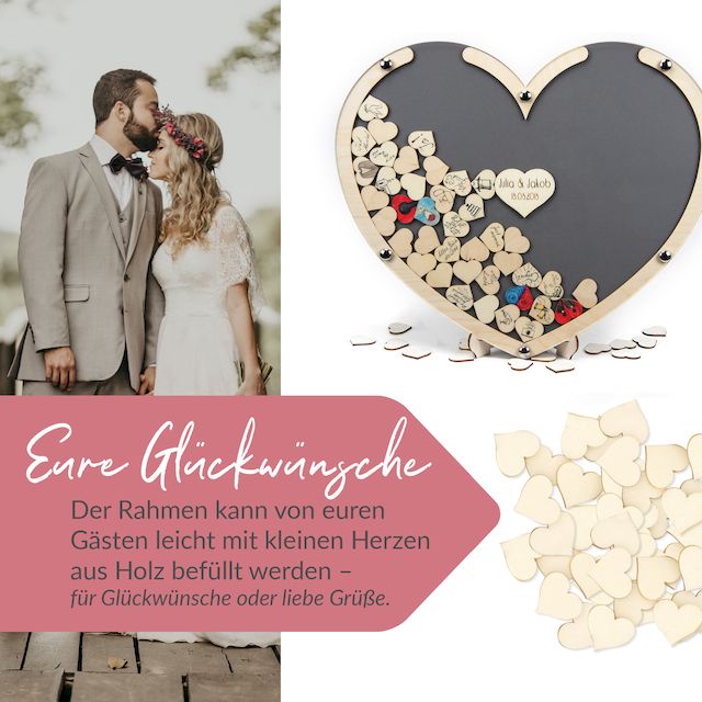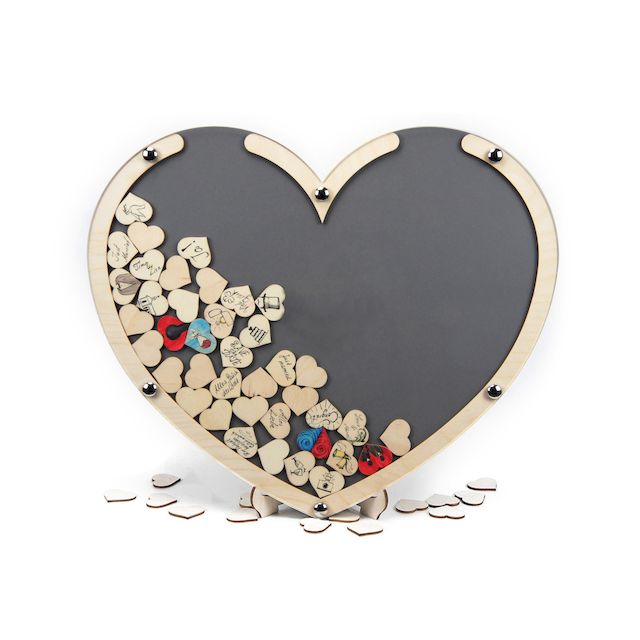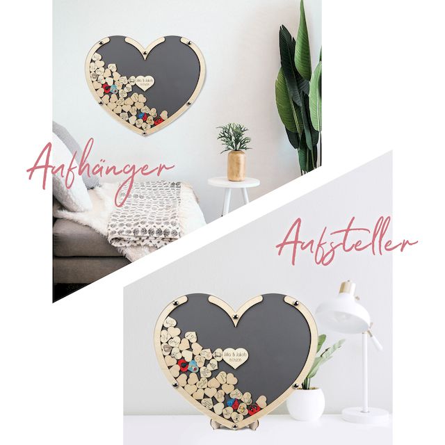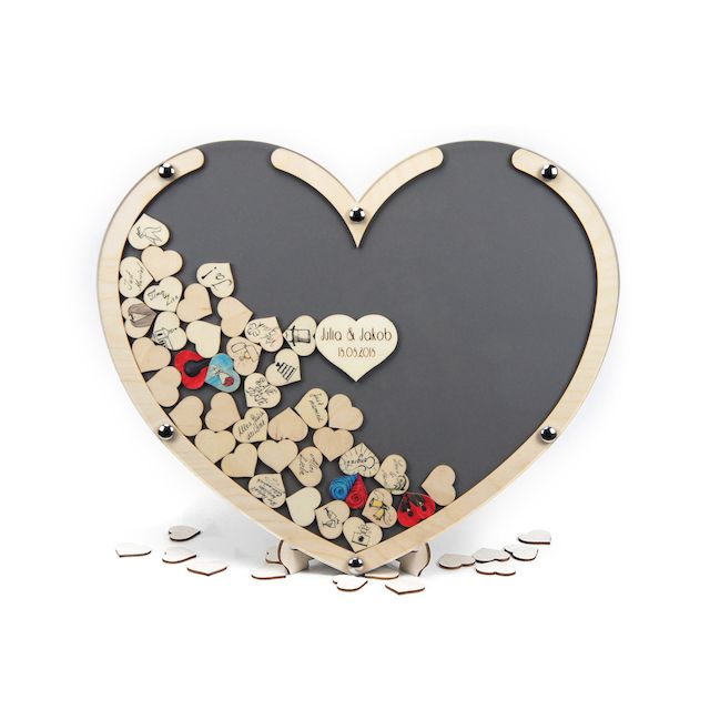 Ihre Freunde und Gäste unterschreiben mit ihrem Namen oder malen persönliche Grüße auf Herzen aus Holz. Gefallen die gestalteten Herzen werfen die Gäste die Kunstwerke oben in den Schlitz. Die perfekte Geschenkidee für Hochzeiten, Geburtstagen oder zum Jubiläum.