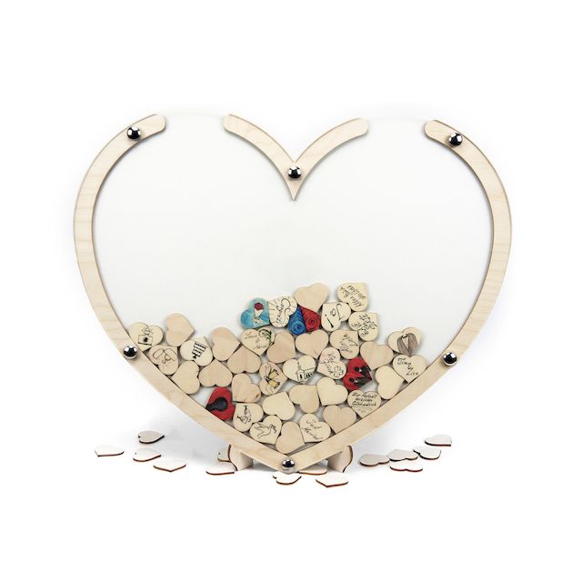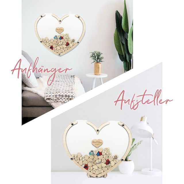 Ihre Freunde und Gäste unterschreiben mit ihrem Namen oder malen persönliche Grüße auf Herzen aus Holz. Gefallen die gestalteten Herzen werfen die Gäste die Kunstwerke oben in den Schlitz. Die perfekte Geschenkidee für Hochzeiten, Geburtstagen oder zum Jubiläum.