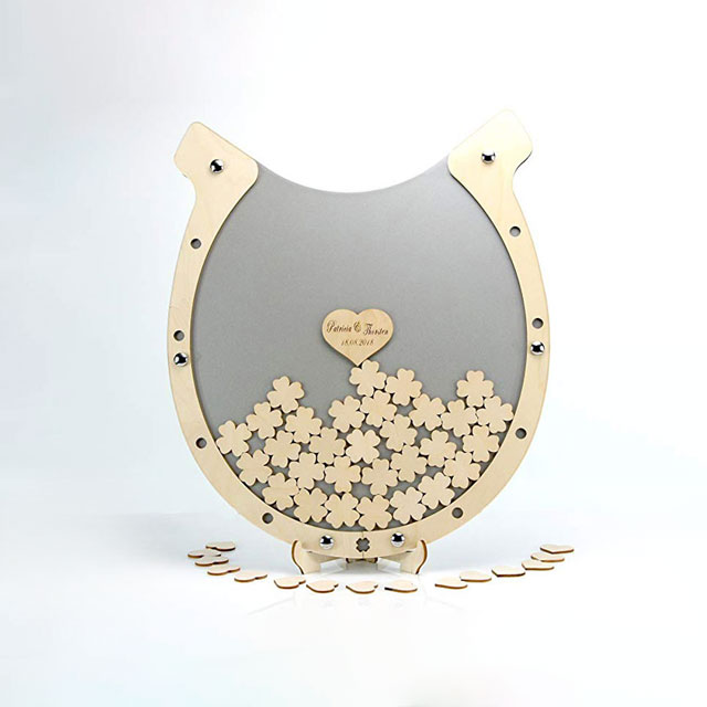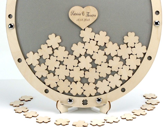 Durch hochwertige Materialien und professionelle Verarbeitung erhalten Sie ein Qualtiätsprodukt, das sich sehen lassen kann. Bitten Sie Ihre Gäste, Nachrichten und Glückwünsche auf die Kleeblätter zu schreiben und diese dann in den Rahmen einzuwerfen. Als kleine Akzente können einige Kleeblätter farblich gestaltet werden
