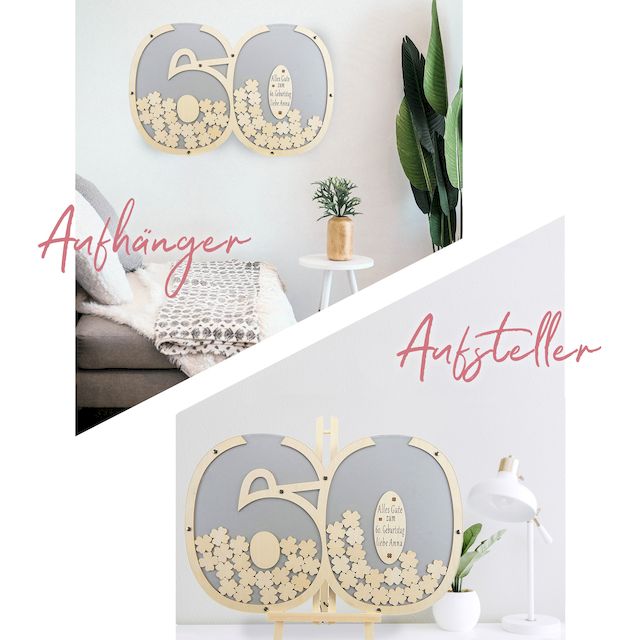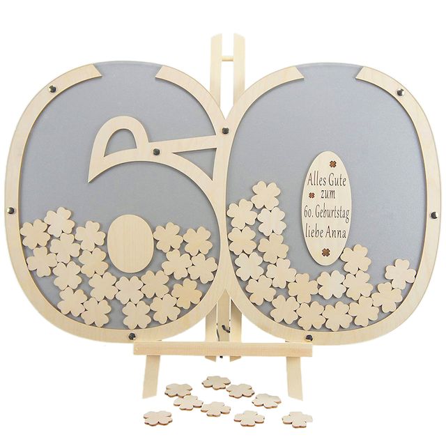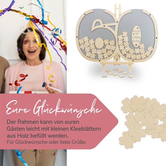 Stellen Sie den Rahmen einfach auf und Ihre Gäste können auf den beigefügten Holzklapptafeln ihren Namen unterschreiben oder persönliche Grüße hinterlassen. Die gestalteten Kleeblätter werden von den Gästen in den Schlitz des Rahmens eingeworfen. Diese einzigartige Alternative zu traditionellen Gästebüchern ist die perfekte Geschenkidee für Hochzeiten, Geburtstage oder Jubiläen.