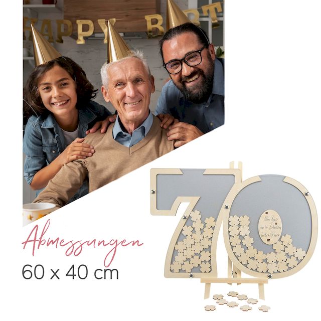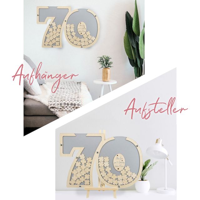 Stellen Sie den Rahmen einfach auf und Ihre Gäste können auf den beigefügten Holzklapptafeln ihren Namen unterschreiben oder persönliche Grüße hinterlassen. Die gestalteten Kleeblätter werden von den Gästen in den Schlitz des Rahmens eingeworfen. Diese einzigartige Alternative zu traditionellen Gästebüchern ist die perfekte Geschenkidee für Hochzeiten, Geburtstage oder Jubiläen.